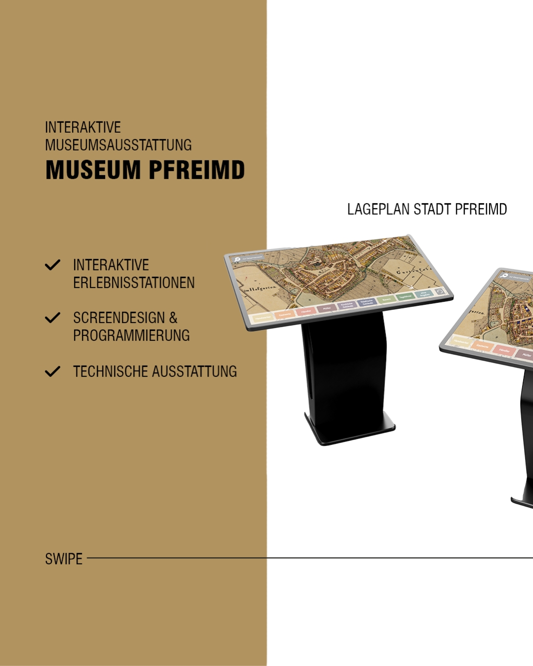 Im Rahmen des Projekts haben wir ein interaktives Konzept entwickelt, das Besucher über moderne Touchscreens auf Entdeckungsreise schickt: von historischen Stadtplänen bis zu Einblicken in das Leben früherer Bewohnerinnen und Bewohner.